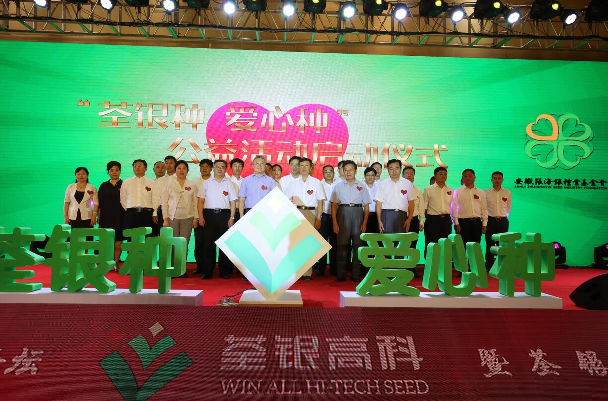 農業部種子管理局張延秋局長、中國種子協會蔣協新副會長、中科院韓斌院士、安徽省農委朱永東副主任、基金會張海銀理事長、荃銀高科張琴董事長,以及荃銀高科經營班子成員、所屬控股子(分)公司負責人共同見證并將愛心種子放入愛心池,“荃銀種、愛心種”的公益活動正式啟動。