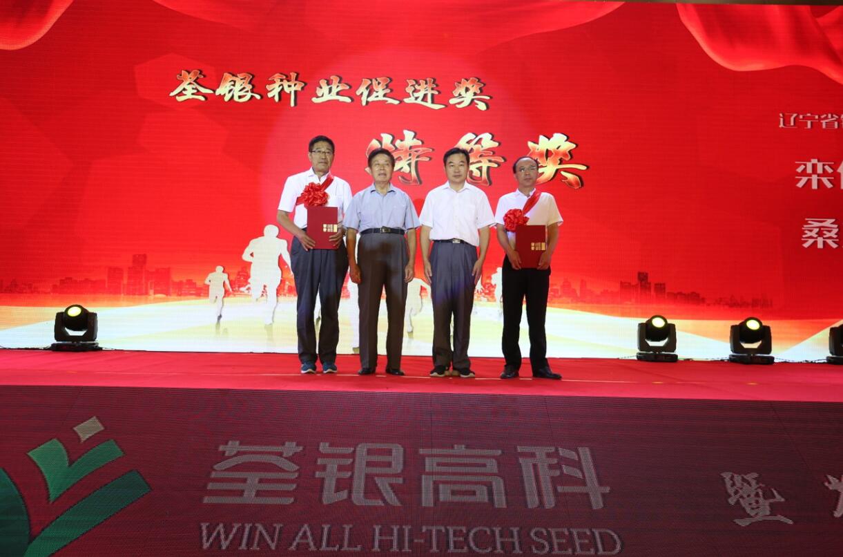 (中國種子協會副會長兼秘書長蔣協新與安徽張海銀種業基金會理事長張海銀為“荃銀種業促進獎”特等獎獲得者鐵嶺市農科院欒化泉研究員、桑立君研究員頒獎)