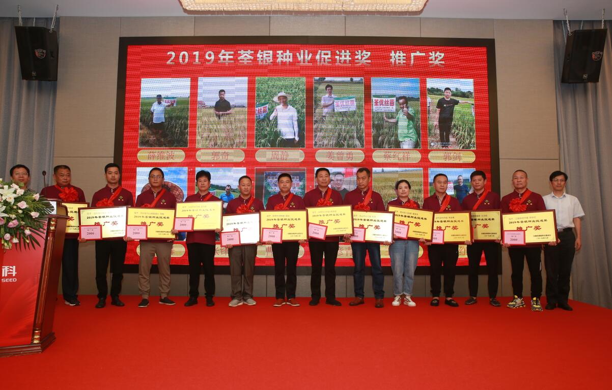 ??? 2019年9月1日,安徽張海銀種業基金會“荃銀種業促進獎”頒獎大會暨荃銀高科水稻品種展示會在合肥召開。中國種業十大功勛人物、荃銀高科創始人、安徽張海銀種業基金會理事長張海銀,安徽省種子管理總站原站長、基金會專家組顧問成員、“荃銀種業促進獎”評審委員會主任孔令傳,荃銀高科副董事長、總經理、基金會副理事長張琴,荃銀高科董事、常務副總經理、基金會副理事長王玉林,荃銀高科副總經理、荃銀農科院院長、首席技術官張從合,基金會秘書長張彤,荃銀高科總經理助理劉義銳、監事會主席謝慶軍,荃銀高科工會主席、基金會監事鄭滿生,中化現代農業、中化化肥等單位領導嘉賓,以及來自湖北省16個縣區180多位三農一線種業工作者參加了會議。